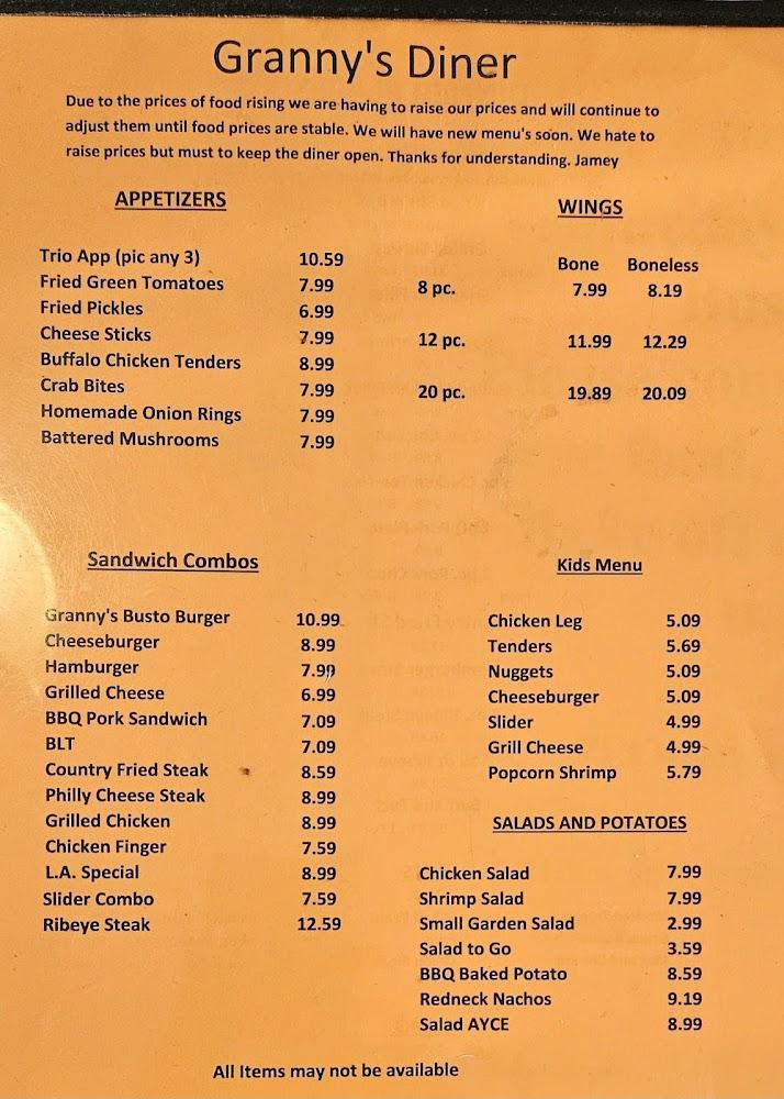 The menu at Granny's Diner highlights Southern fare with options for everyone. Expect comfort food classics like fried chicken, mashed potatoes, and a varied salad bar. Appetizers like fried pickles and buffalo chicken tenders offer tasty starters for sharing. Each plate delivers hearty flavors that resonate with locals and visitors alike.